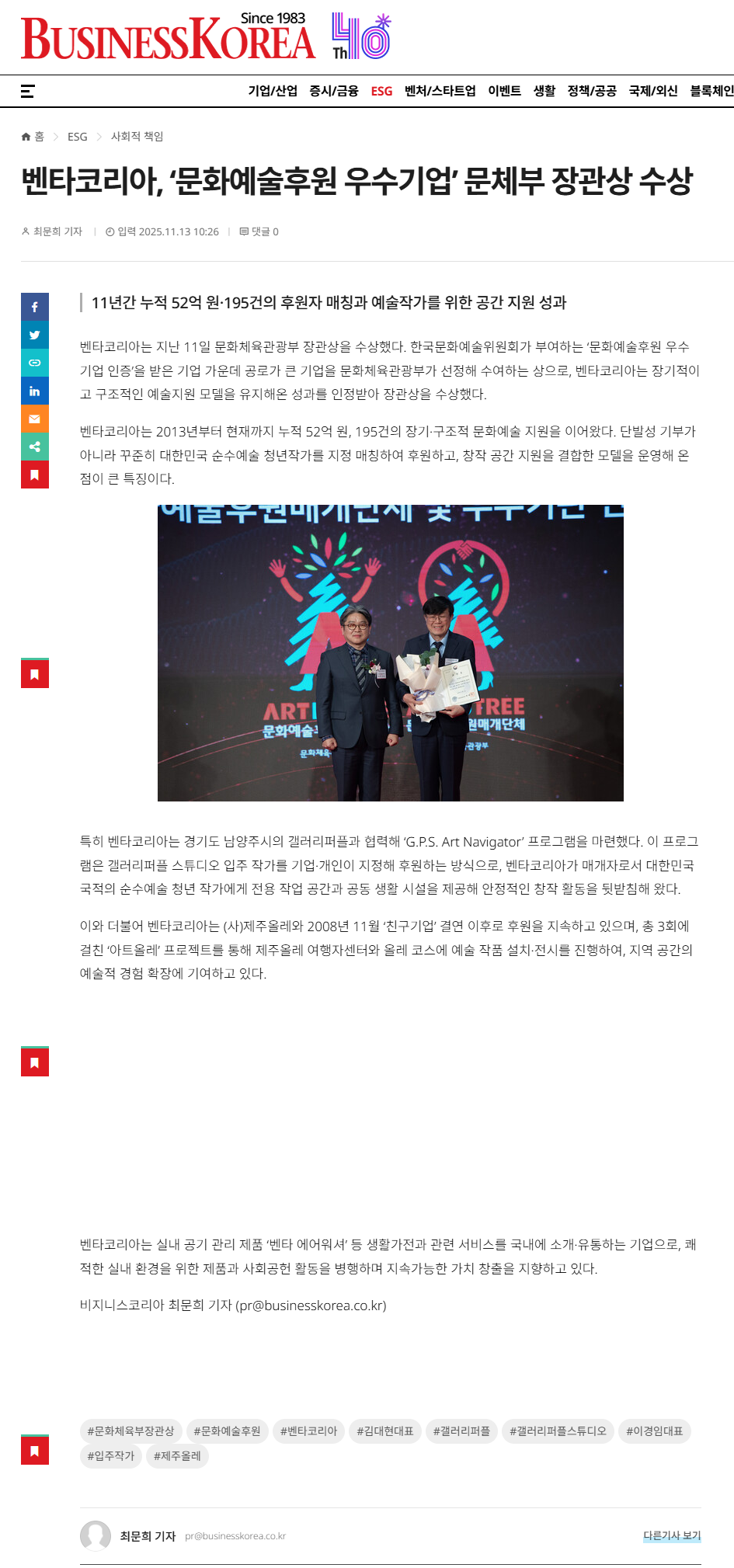 벤타코리아, 문화체육관광부 장관상 수상_ 비지니스 코리아