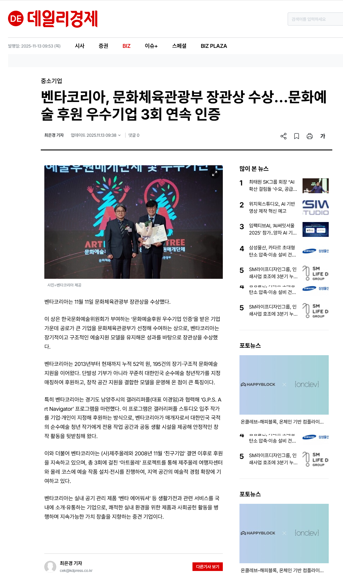 벤타코리아, 문화체육관광부 장관상 수상_ 데일리경제