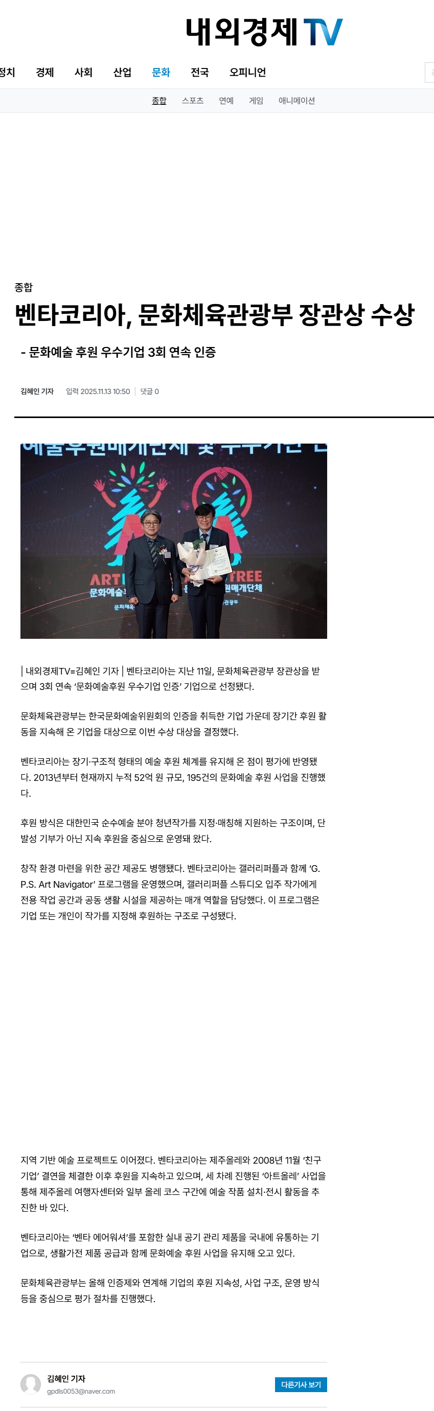 벤타코리아, 문화체육관광부 장관상 수상_내외경제tv