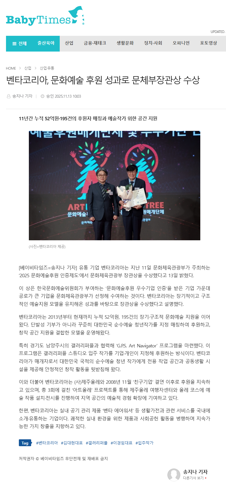 벤타코리아, 문화체육관광부 장관상 수상_ 베이비타임즈