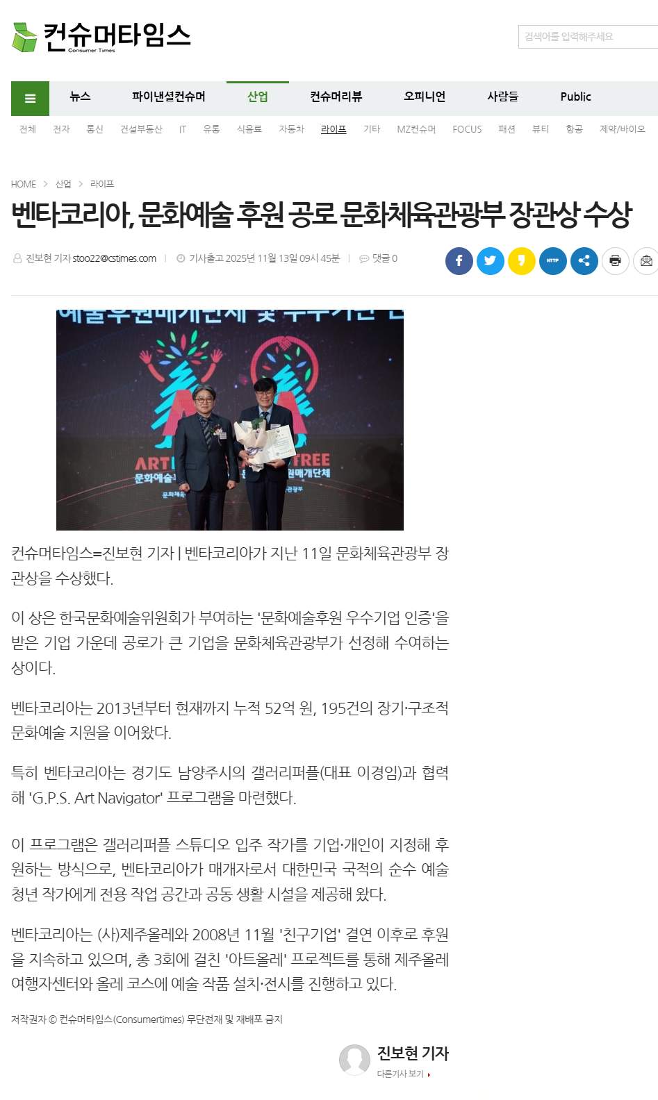 벤타코리아, 문화체육관광부 장관상 수상_ 컨슈머타임즈